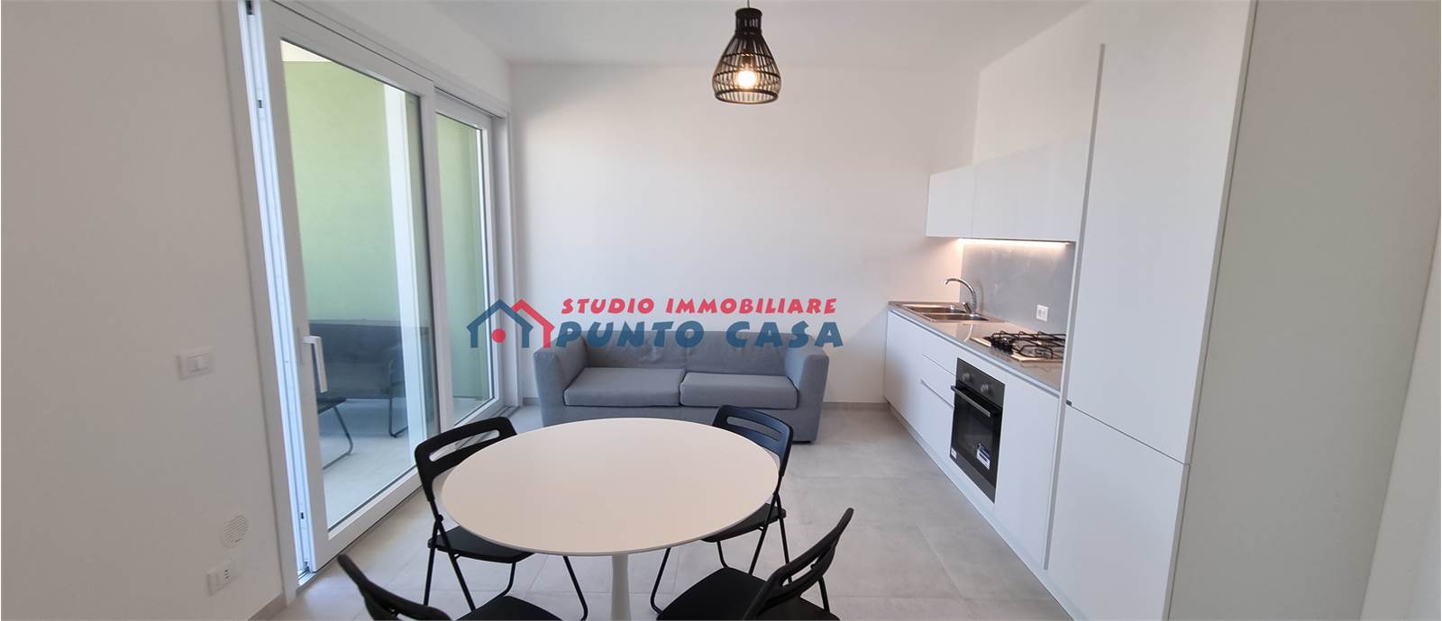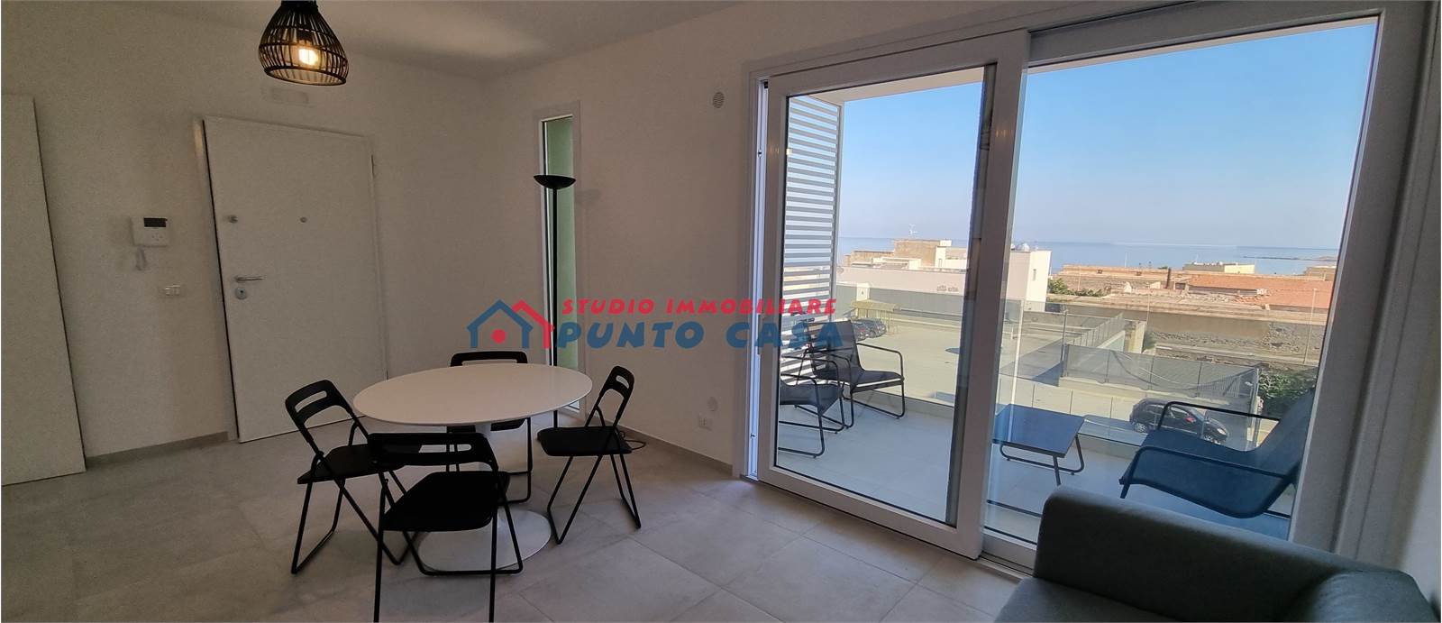 - ingresso su soggiorno con cucina a vista e portafinestra conducente a veranda con vista mare, cucina completa di elettrodomestici, tavolo rotondo con 4 sedie, divano a due posti.