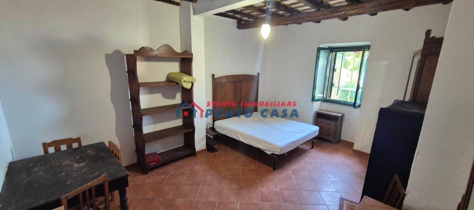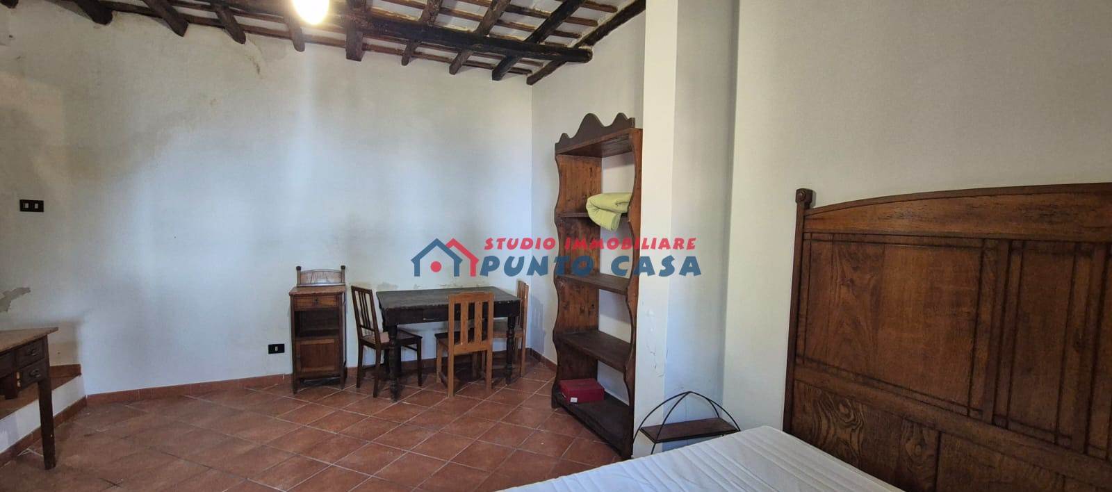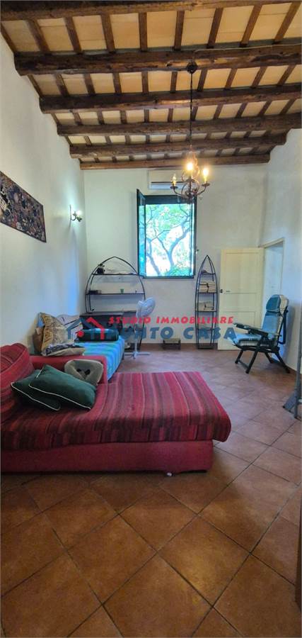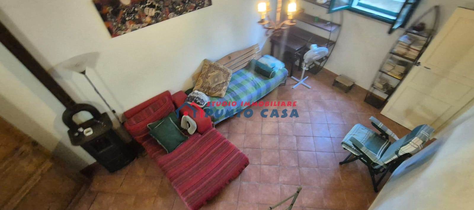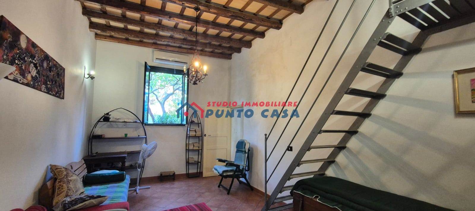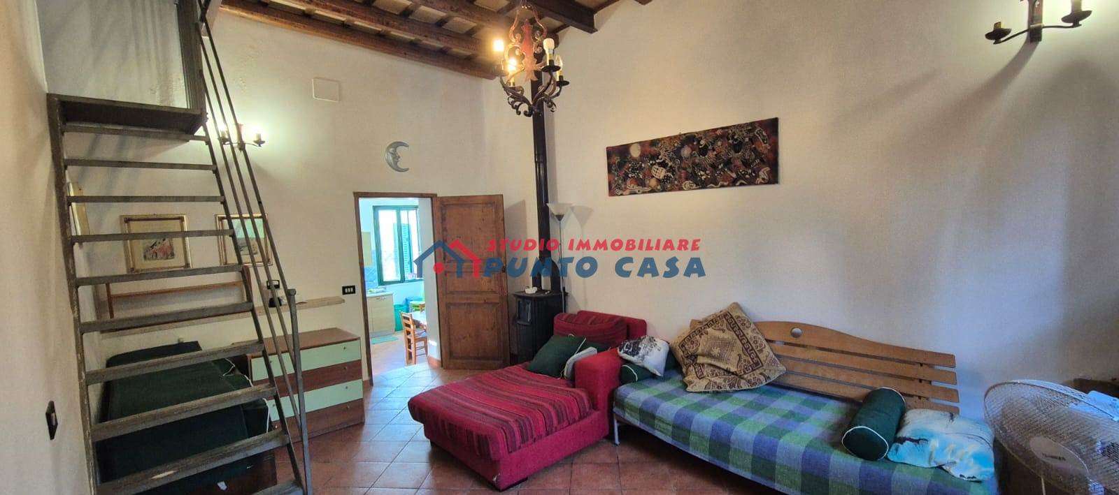 - soggiorno con scala in ferro conducente al piano superiore e stufa a legna;